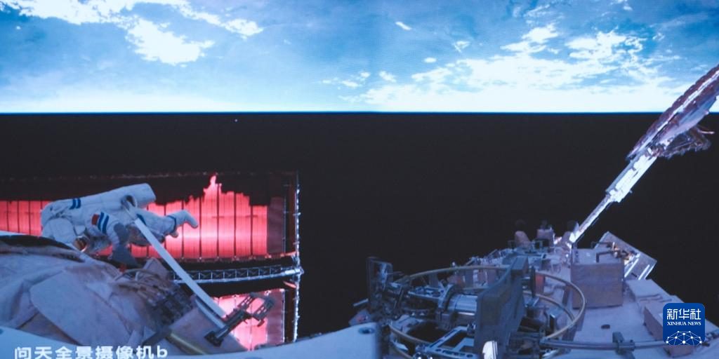 12月17日在北京航天飞行控制中心拍摄的神舟十九号航天员蔡旭哲在空间站组合体舱外工作的画面。新华社记者 李杰 摄