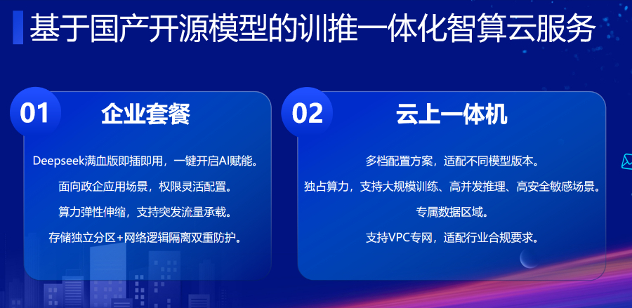 另外,新华网全新推出“基于国产开源模型的训推一体化智算云服务”,提供企业套餐模式和云上一体机模式两种服务模式,助力政企客户快速部署AI应用。企业套餐模式下,Deepseek满血版即插即用,可一键开启AI赋能,算力弹性可伸缩,突发流量可承载,存储独立分区和网络逻辑隔离,实现数据双重防护。云上一体机模式则具有多档配置方案,适配不同参数模型版本,用户独占算力,VPC专网互通,支持大规模训练、高并发推理、高安全敏感场景,满足合规需求。