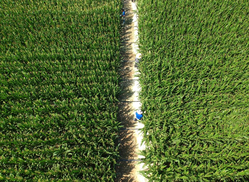 2月10日,在三亚市崖州湾科技城,隆平生物技术(海南)有限公司的科研人员在科研玉米地里工作(无人机照片)。(新华社记者 赵颖全 摄)