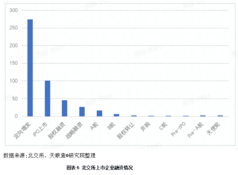 截止到2022年6月30日,北交所101家已上市企业中,共发生融资事件481次(不含观典防务科创板转板上市)。其中,定向增发274次,战略融资27次,A轮融资27次,B轮融资16次。从融资情况可以看出,北交所上市企业在企业发展初期受到风险资本投资较少,定向增发是主要融资手段。
