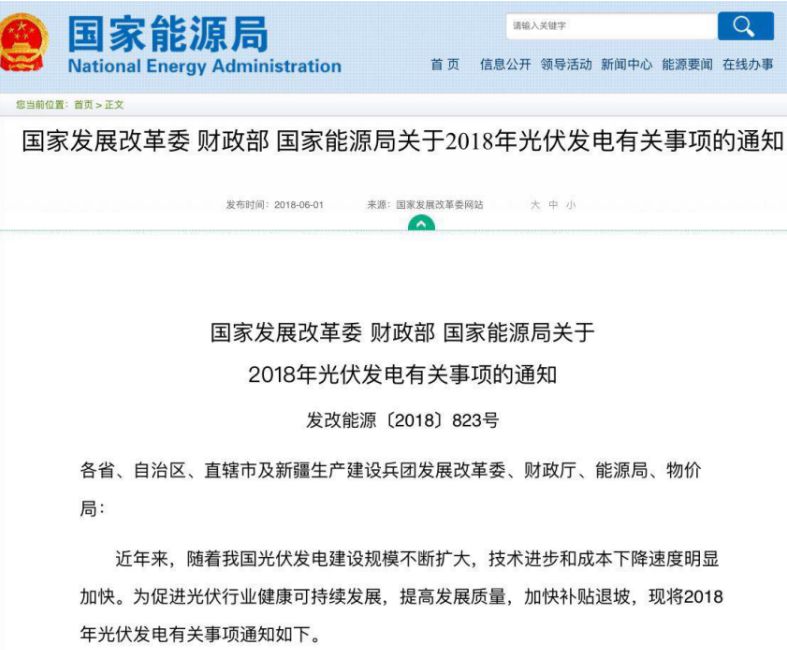 6月1日,国家能源局在官网表示,为促进光伏行业健康可持续发展,提高发展质量,加快补贴退坡,印发《关于2018年光伏发电有关事项的通知》,即俗称光伏新政。