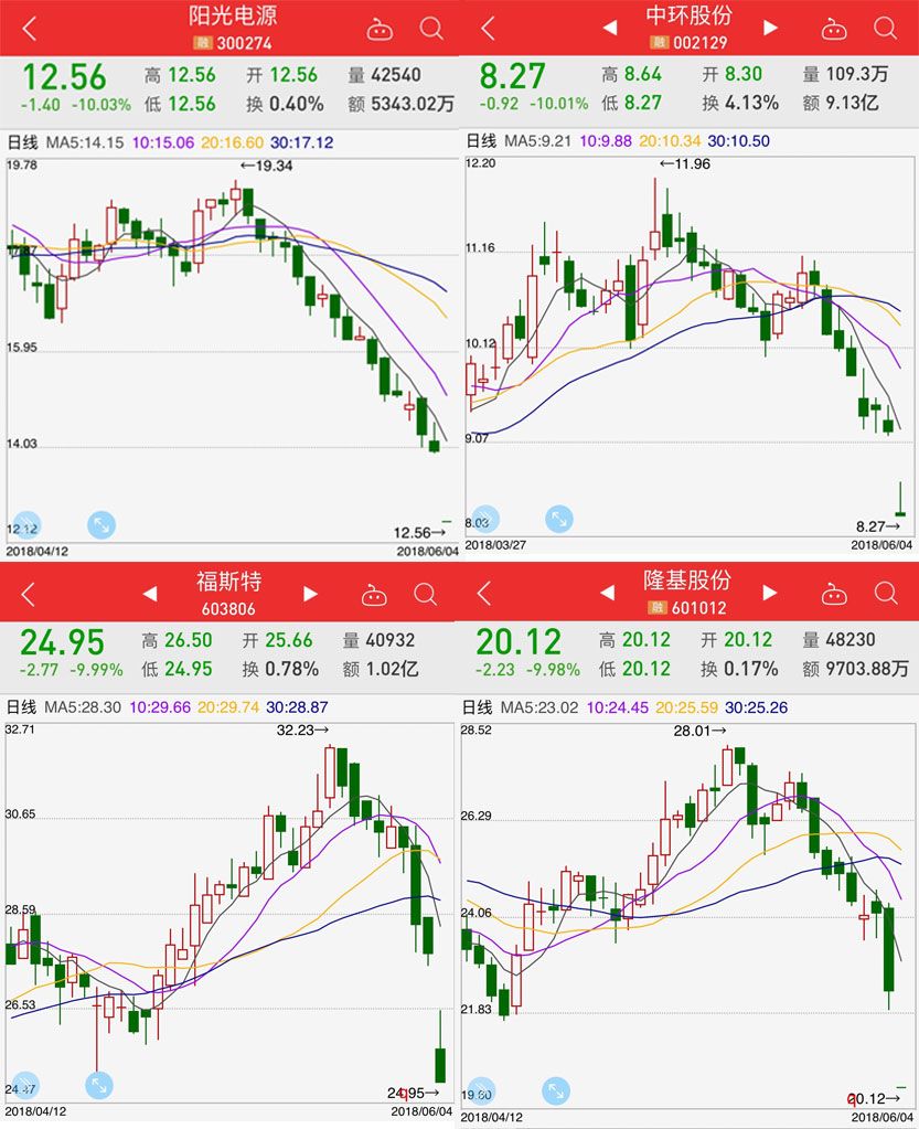 今天(6月4日),A股光伏板块全线下挫,阳光电源、中环股份、福斯特和隆基股份等4只光伏龙头股,在开盘后便迅速跌停,直至收盘跌停板仍未打开。