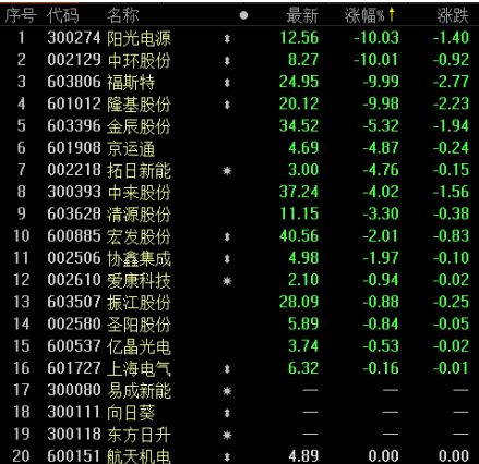 今日,A股方面,阳光电源、中环股份、福斯特和隆基股份等4只光伏龙头股,在开盘后便迅速跌停,直至收盘跌停板仍未打开。整体来看,光伏板块共计20只个股:3只停牌,16只下跌,1只平盘,无1只上涨。