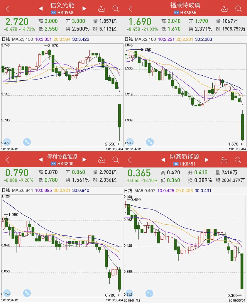 港股光伏概念股也没有逃脱开盘后全线下挫命运,信义光能、福莱特玻璃跌幅均超过15%,保利协鑫能源和协鑫新能源收盘跌幅均超过9%。