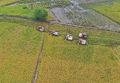 时值秋收,农业大省四川省各地农田里一片繁忙的收割景象。 新华社图片