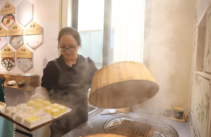 4月27日,工作人员在浙江省嘉兴市余新镇稻米文化馆制作米糕。