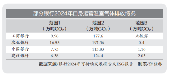 例如,工商银行披露的2024年排放范围1为9.96万吨CO2,包括燃料煤、天然气、液化石油气、汽柴油等化石能源燃烧产生的直接排放;范围2为177.6万吨CO2,为电力和外购热力及冷量导致的间接排放。其未公布范围3的碳排放数据。