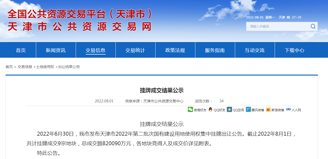 天津2022年第二批次集中供地:成交9宗地块 成交额约82亿元