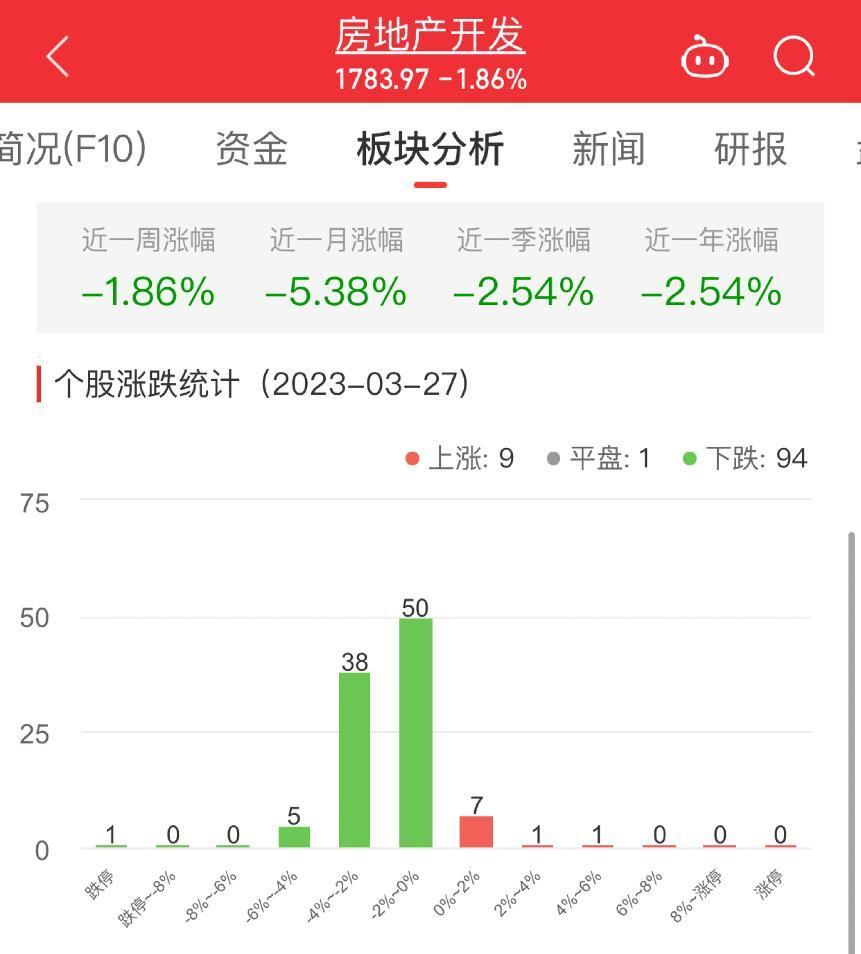 今日,房地产开发板块整体跌幅1.86%,其中9只股票上涨,1只股票平盘,94只股票下跌。