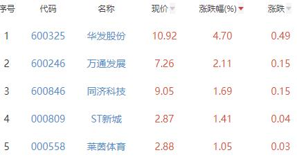其中,华发股份、万通发展、同济科技、ST新城、莱茵体育位列板块涨幅前五位,涨幅分别为4.70%、2.11%、1.69%、1.41%、1.05%。