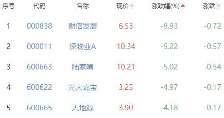 财信发展、深物业A、陆家嘴、光大嘉宝、天地源位列涨幅榜后五位,涨幅分别为-9.93%、-5.22%、-5.02%、-4.97%和-4.18%。
