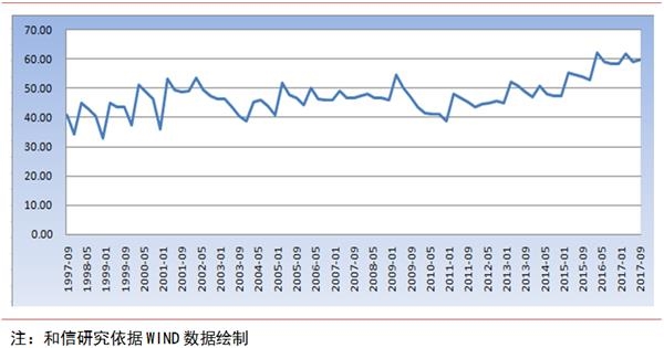 图2:1997年以来第三产业对GDP贡献率%(季)变化情况