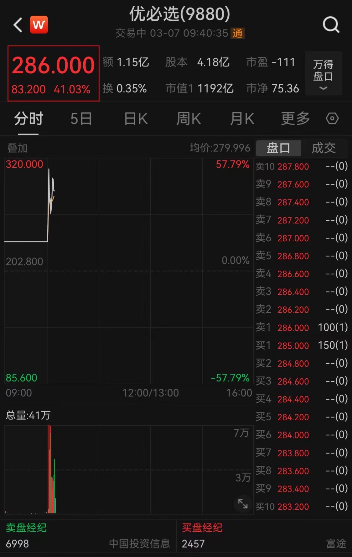 截至9时40分,优必选股价上涨41.03%,报286港元/股,最新市值为1192亿港元。