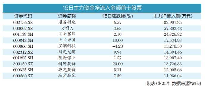 资金面上,市场缩量调整之下,资金情绪趋于谨慎。Wind数据显示,15日沪深两市主力资金净流出246.74亿元,其中1832只股票出现主力资金净流入,3263只股票出现主力资金净流出,沪深300板块主力资金净流出87.06亿元。