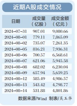 近期,A股市场持续保持地量成交。Wind数据显示,7月31日,A股市场成交额为9080.66亿元,之后,A股市场成交持续缩量,8月12日成交额缩至5000亿元以下,8月13日成交额降至4798.77亿元,创2019年12月24日以来新低。A股市场已连续3个交易日成交额在5000亿元以下。