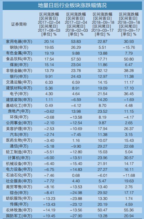 从上述2017年2月3日和2018年9月17日的地量日之后的情况来看,Wind数据显示,上证指数、深证成指、创业板指、沪深300指数、万得全A指数五大指数中,2017年2月3日后半年及一年的上涨占比均为80%,平均涨幅分别为3.28%、11.73%,涨幅最大的沪深300指数分别达11.78%、27.87%;2018年9月17日后半年及一年的上涨占比均为100%,平均涨幅分别为17.19%、21.42%,涨幅最大的创业板指分别达20.77%、26.32%。从行业情况来看,2017年2月3日后半年,家用电器、钢铁、有色金属行业领涨,之后一年,食品饮料、家用电器、钢铁行业领涨。2018年9月17日后半年,农林牧渔、非银金融、综合行业领涨,之后一年,农林牧渔、食品饮料、非银金融行业领涨。