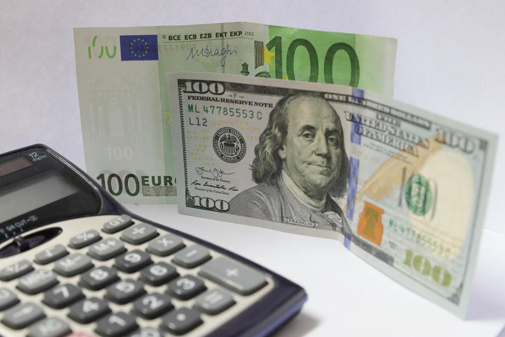 这是2022年7月7日在比利时首都布鲁塞尔拍摄的欧元(后)和美元纸币。新华社记者郑焕松摄
