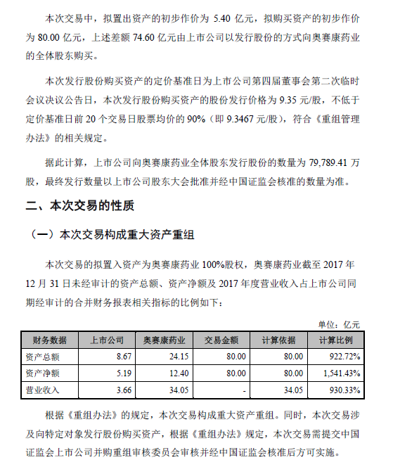 本次交易中,拟置出资产的初步作价为5.40亿元,拟购买资产的初步作价为80.00亿元,上述差额74.60亿元由上市公司以发行股份的方式向奥赛康药业的全体股东购买。