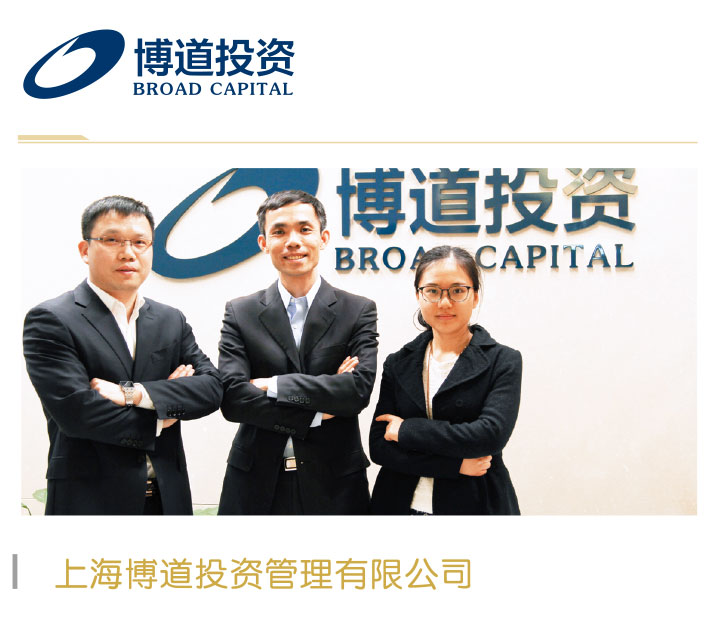 公司成立于2013年5月,由业界一批经验丰富、享有较高声 望的资深专业人士创立,是第一批通过中国基金业协会登记 的私募投资基金管理人;基金业协会私募证券专业委员会会 员单位之一。公司成立三年多以来,资产规模超过170亿, 属于业内少有的多策略资产管理平台。博道投资着力打“全 天候”的资产管理团队,目前已经成立了宏观研究团队、股 票研究团队、量化团队和固定收益团队,着力布局“多策略” 产品线。以价值投资理念为基础,关注趋势和均值回归,通 过对宏观、市场、行业、标的的分析和解构,发展能够应对 全天候的多策略,并在此基础上,动态优化风险收益配比, 提供多元、丰富和稳定收益的多策略组合。