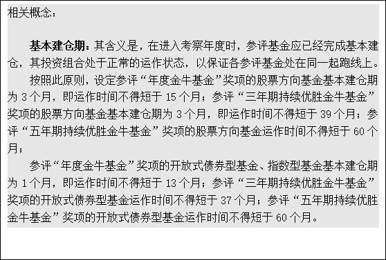 基金业金牛奖对参评对象的规模、期限、合规合约情况作了一系列规定。具体内容详见后文“2)基金(基金管理公司)评奖的理论基础、应用的指标体系和方法”中的“⑶各奖项的评选及评选指标体系”,其中对各奖项的参评条件均有严格限制。