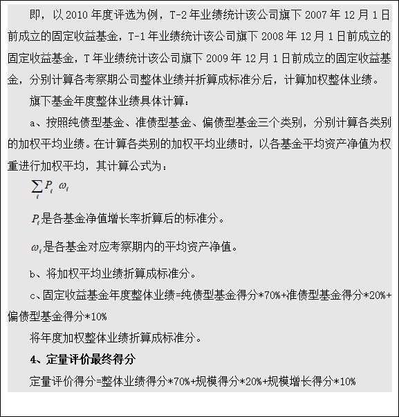 即,以2010年度评选为例,T-2年业绩统计该公司旗下2007年12月1日前成立的固定收益基金,T-1年业绩统计该公司旗下2008年12月1日前成立的固定收益基金,T年业绩统计该公司旗下2009年12月1日前成立的固定收益基金,分别计算各考察期公司整体业绩并折算成标准分后,计算加权整体业绩。