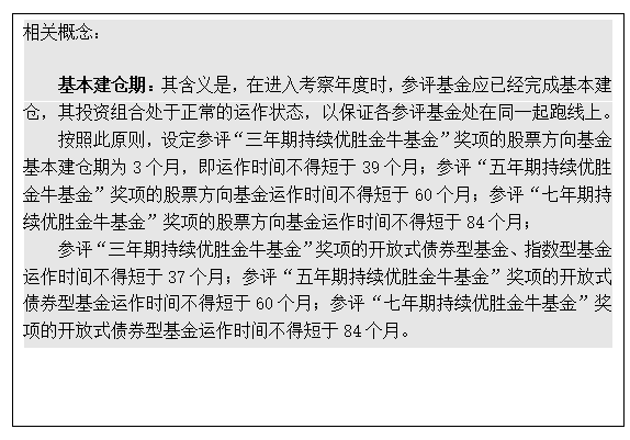 计算业绩的旗下基金范围:定量评价部分的基金业绩,只计算满足基本建仓期条件的指数基金业绩(含未达到金牛基金规模限制条件基金)。