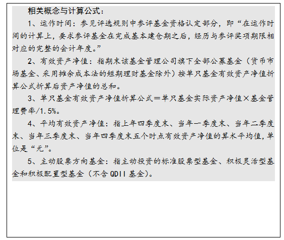 计算业绩的旗下基金范围:定量评价部分的基金业绩,只计算满足基本建仓期条件的偏股型QDII基金业绩(含未达到金牛基金规模限制条件基金)。