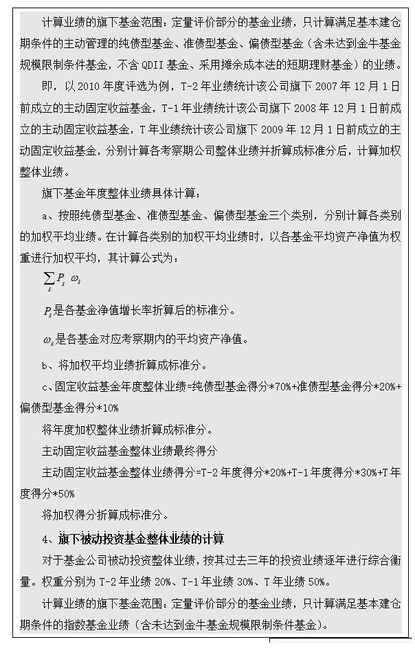即,以2010年度评选为例,T-2年业绩统计该公司旗下2007年12月1日前成立的固定收益基金,T-1年业绩统计该公司旗下2008年12月1日前成立的固定收益基金,T年业绩统计该公司旗下2009年12月1日前成立的固定收益基金,分别计算各考察期公司整体业绩并折算成标准分后,计算加权整体业绩。