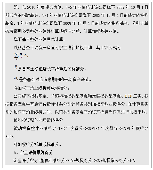 对于基金公司被动投资整体业绩,按其过去三年的投资业绩逐年进行综合衡量。权重分别为T-2年业绩20%、T-1年业绩30%、T年业绩50%。