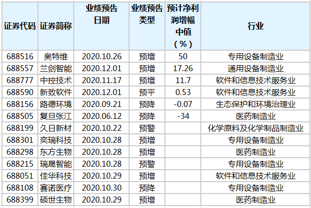 证券时报·数据宝统计显示,截至12月7日,有33家科创板公司公布了2020年业绩预告。业绩预告类型显示,预增公司9家;业绩预降公司4家、预亏公司有13家。以预计净利润增幅中值统计,净利润增幅在50%~100%之间的有1家。