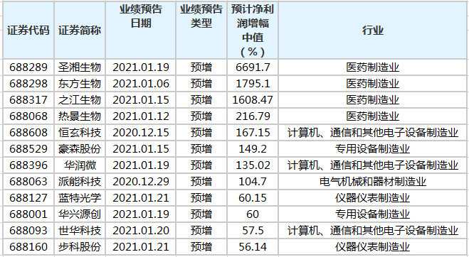 证券时报?数据宝统计显示,截至1月21日,有70家科创板公司公布了2020年业绩预告。业绩预告类型显示,预增公司41家;业绩预降公司7家、预亏公司有14家。以预计净利润增幅中值统计,共有8家公司净利润增幅超100%;净利润增幅在50%~100%之间的有17家。