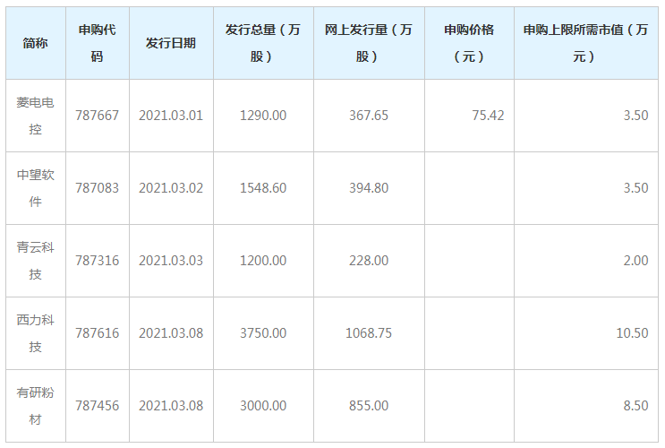 根据发行安排,5只科创板新股即将发行。3月1日发行的是菱电电控;3月2日发行的是中望软件;3月3日发行的是青云科技;3月8日发行的是有研粉材、西力科技。即将发行的这5只新股合计预计募资35.63亿元。