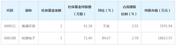 去年年末社保基金出现在奥福环保、柏楚电子前十大流通股东榜。