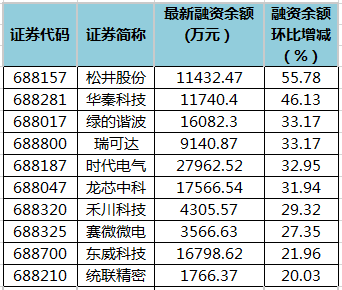 wind统计显示,6月27日共有228只科创板个股融资余额环比增加。其中,10股融资余额增幅超过20%。融资余额增幅最大的是松井股份,最新融资余额为11432.47万元,环比增幅达55.78%;融资余额增幅较大的还有华秦科技、绿的谐波、瑞可达、时代电气、龙芯中科等股。(阙福生)