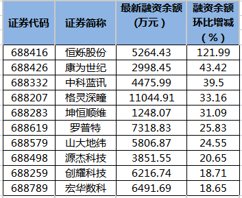 恒烁股份等8只科创板股融资余额增幅超20%