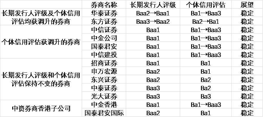 具体来看,获穆迪评级的13家中国券商机构包括11家中资券商和2家中资券商的香港子公司。穆迪对13家券商的展望均为“稳定”,但长期发行人评级和个体信用评估各有不同。其中,长期发行人评级和个体信用评估均获调升的证券公司有2家,分别是华泰证券和东方证券。华泰证券的长期发行人评级由Baa2级升为Baa1级,个体信用评估由Ba1级升为Baa3级;东方证券的长期发行人评级由Baa3级升为Baa2级,个体信用评估由Ba2级升为Ba1级。