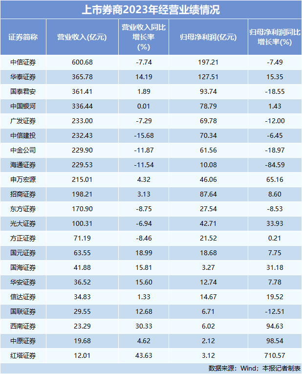 从同比增幅看,头部券商因业绩基数大,大部分增幅不明显,而中小券商则表现出较强弹性。Wind数据显示,在上述21家上市券商中,2023年营业收入实现正增长的有13家,其中同比增长超10%的券商有7家。