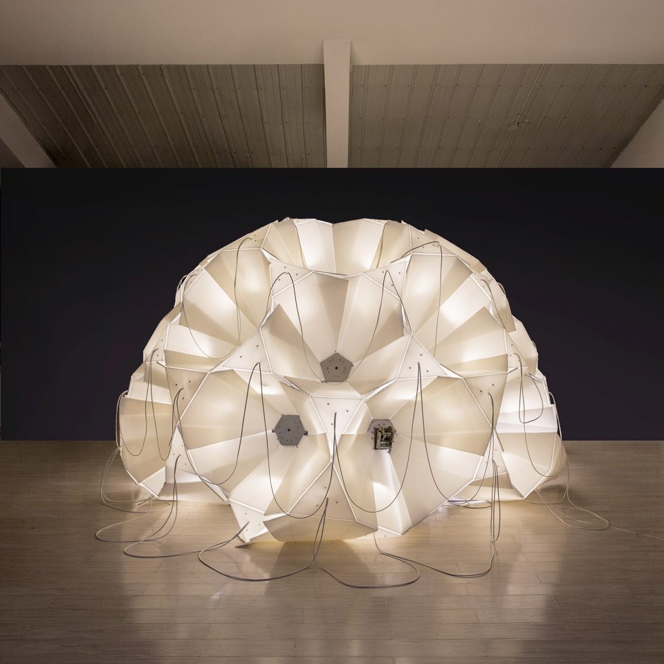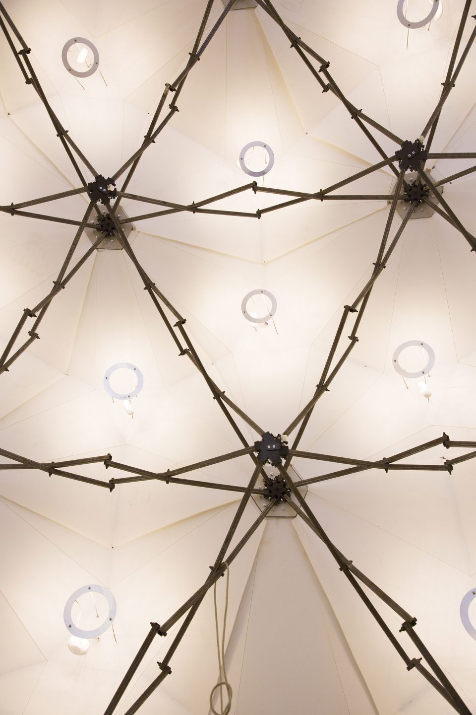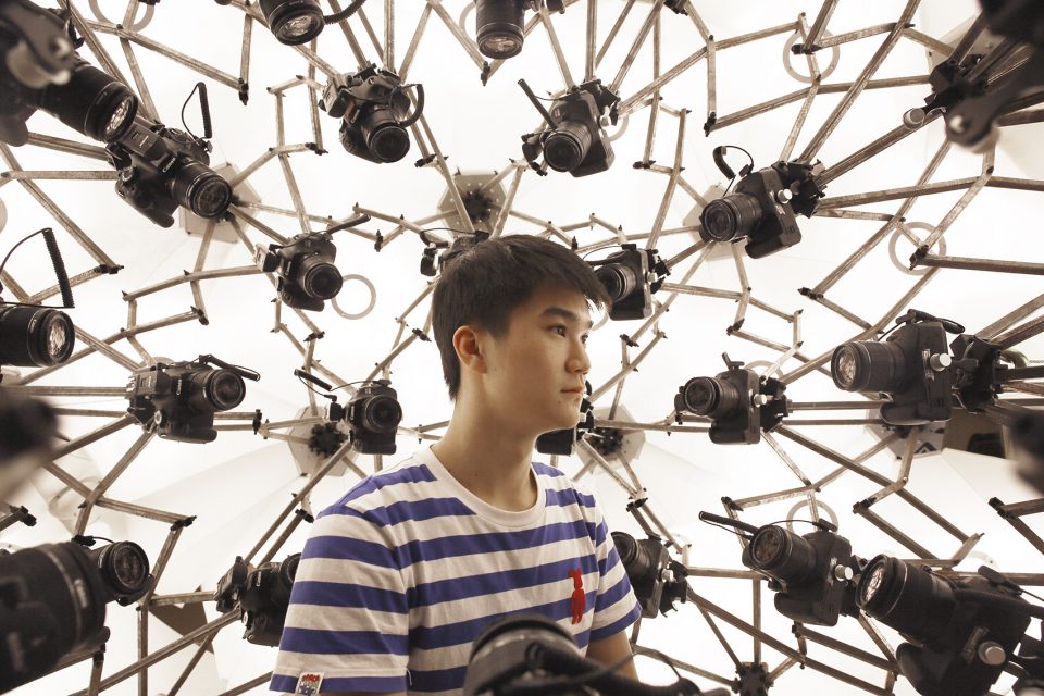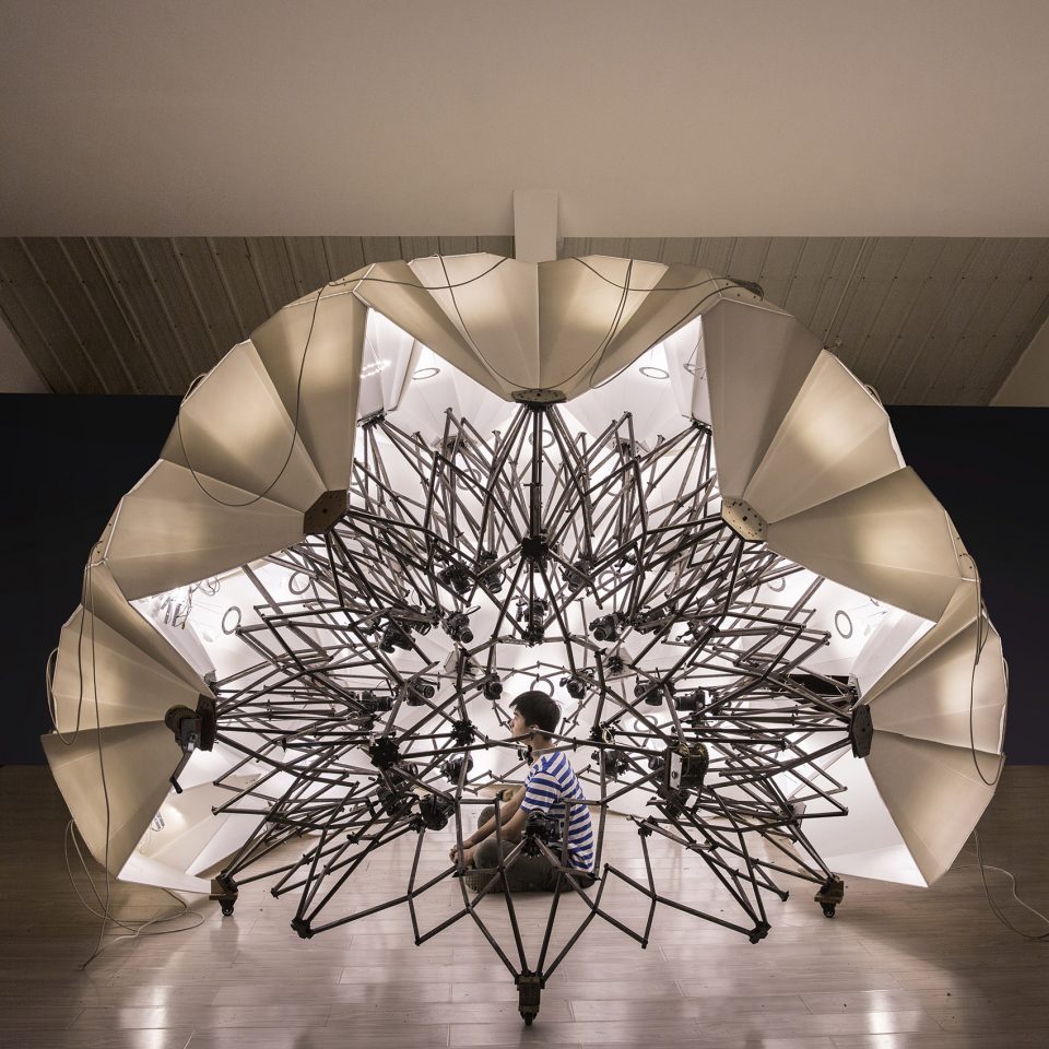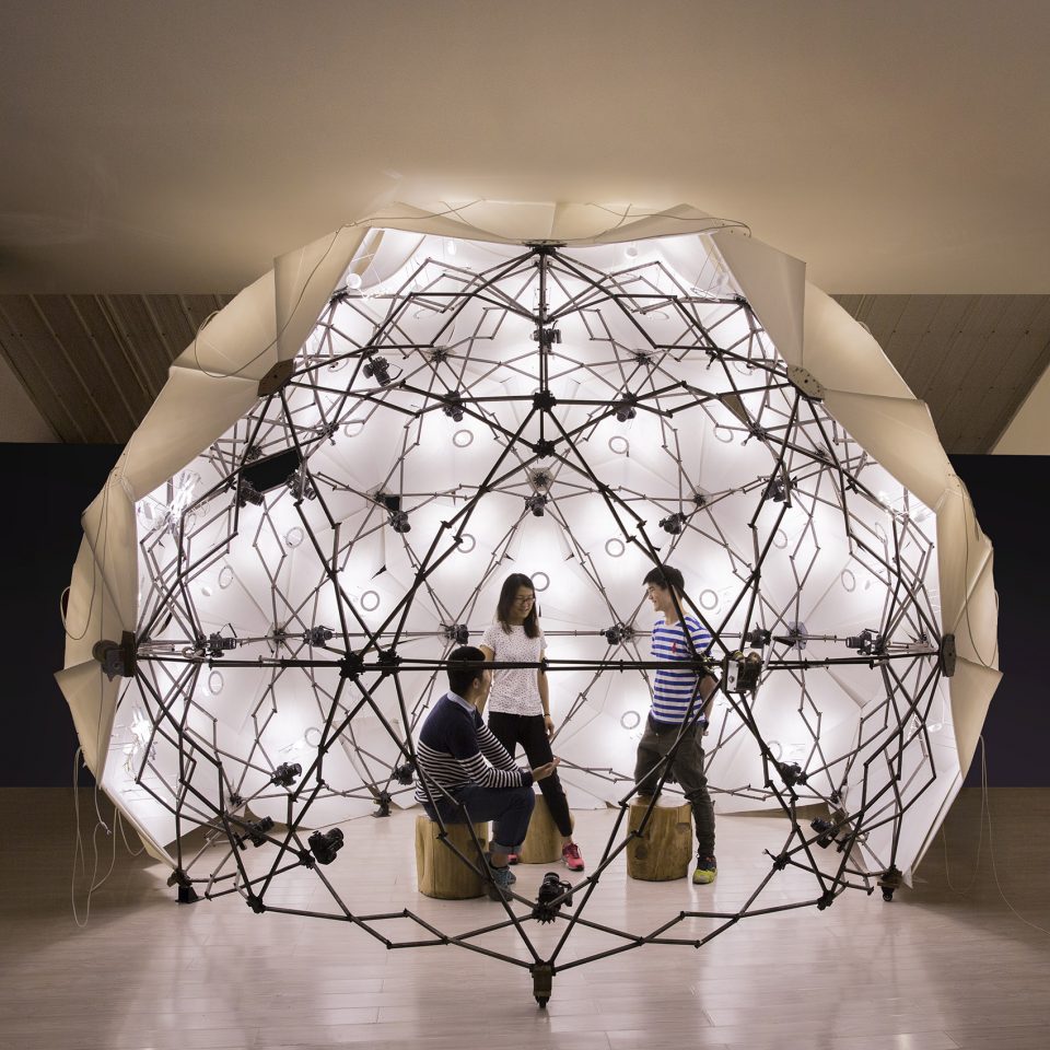 3D扫描舱是一个用于三维扫描的摄影棚。它的与众不同之处在于,可以即时完成对大小规格不等物体的数字化三维扫描。拍摄物被置于一个由一百多台定焦单反相机构成的球面阵当中,该结构受到霍伯曼球(hoberman sphere)的启发,每个节点上都有一台相机,可实现等速运动。