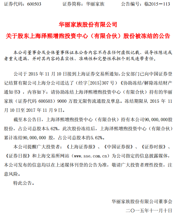 华丽家族11月10日晚间公告称,公司于11月10日接到上交所通知,公安部门已向中登公司上海分公司送达了《协助冻结/解除冻结财产通知书》,请其协助冻结上海泽熙增煦投资中心(有限合伙)持有的公司9000万股无限售流通股(占公司总股本的5.62%)及孳息,冻结期限从2015年11月10日至2017年11月9日。