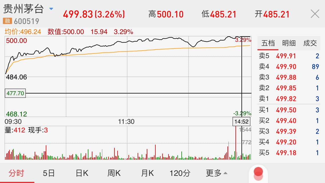 贵州茅台早盘高开后,一路走高,午后持续发力,接近尾盘,达到了500.10元/股。收盘时,小幅回落,报收499.83元/股,全天大涨3.26%。