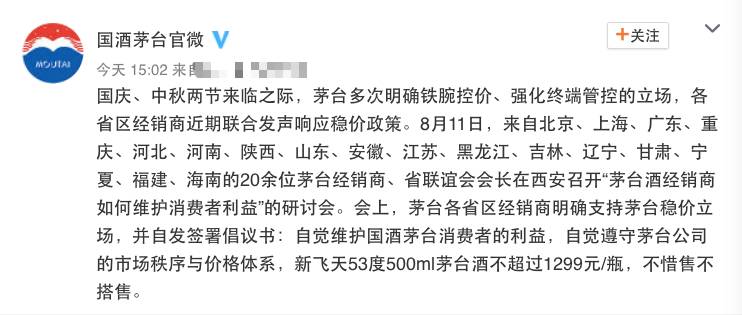 面对茅台零售价的涨价风波,8月14日,茅台官方微博再次发声,国庆、中秋两节来临之际,茅台多次明确铁腕控价、强化终端管控的立场,各省区经销商近期联合发声响应稳价政策。