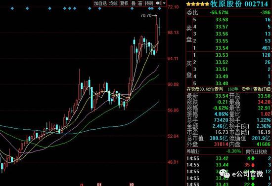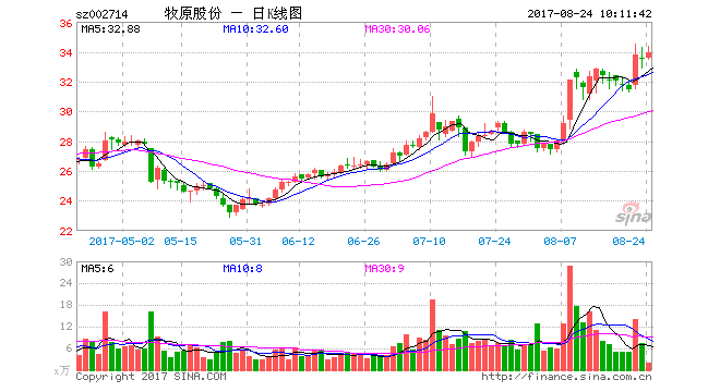 牧原股份股价从5月24日的22.9元/股,持续上涨至8月22日最高34.48元/股,三个月累计涨幅超过46%,期间在8月初时还曾出现三日累计上涨超过16%的强势走势。