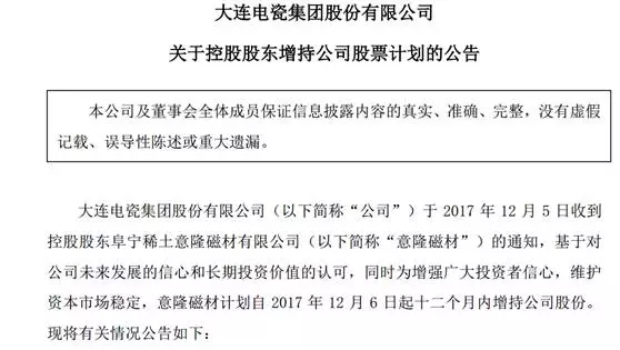 根据12月5日晚间大连电瓷披露的控股股东意隆磁材增持计划,意隆磁材计划自2017年12月6日起十二个月内以自有或自筹资金增持公司股份,累计增持比例不低于公司总股本的5%,即不少于2037.48万股,而且增持价格不设定价格区间。