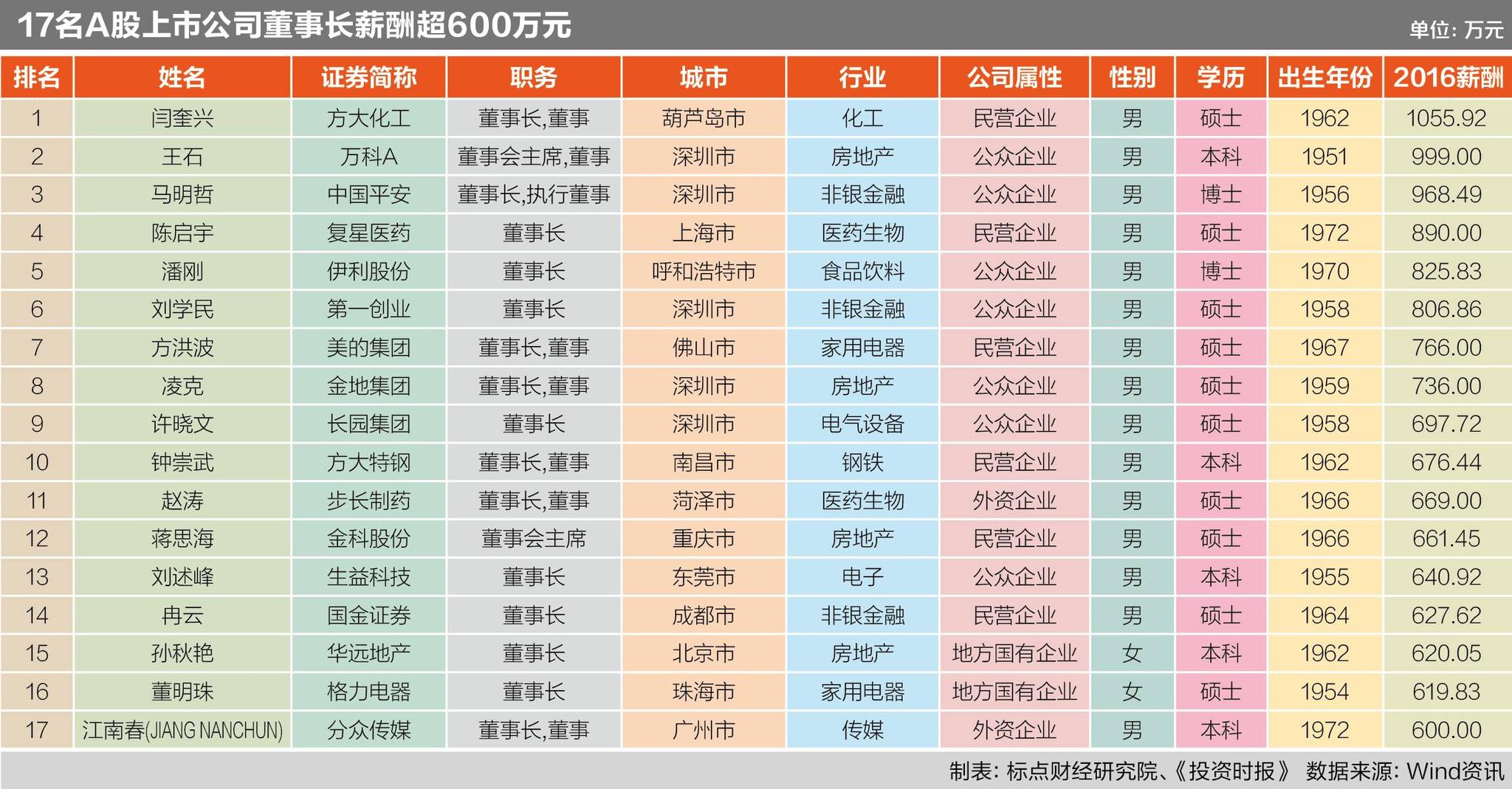 需要说明的是,在进行薪酬分析时,考虑到董事长所持股份的市值随股价随时波动,不具有确定性,因此,本次《投资时报·2017中国上市公司董事长全样本报告》未将其个人持股市值收入纳入统计,仅选取了各位董事长在2016年于上市公司领取的薪酬作为分析依据。对于上市公司没有披露的,亦不纳入本次薪酬方面的统计。