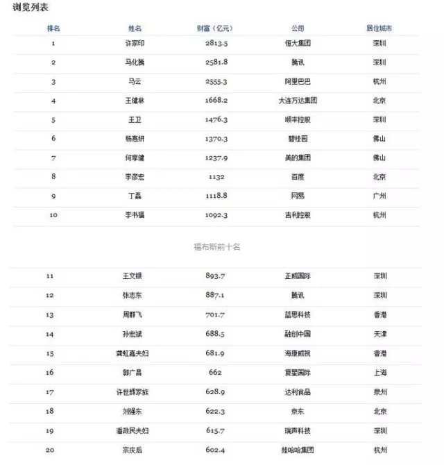 福布斯中国富豪榜前20名