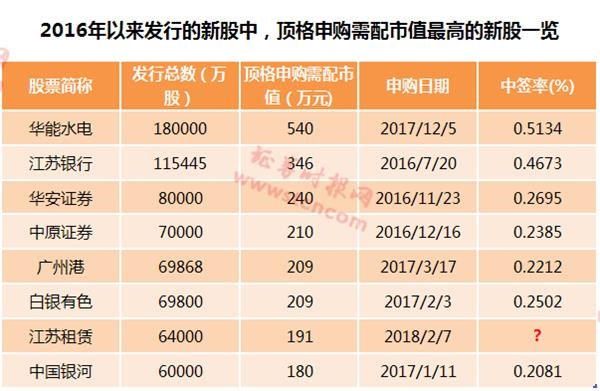 顶格申购市值规模略超江苏租赁的新股中,广州港和白银有色的中签率分别为0.2212%和0.2502%;略低的中国银河的中签率也达0.2081%。即便以中国银河的中签率来推算,顶格申购江苏租赁的中签概率也接近40%。