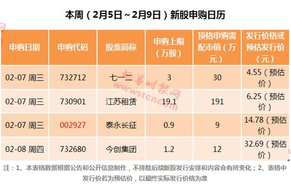根据目前的公开信息,本周(2月5日~2月9日)初步计划将开启申购的新股中,仅周三就有3只:七一二、江苏租赁、泰永长征,周四有1只今创集团。