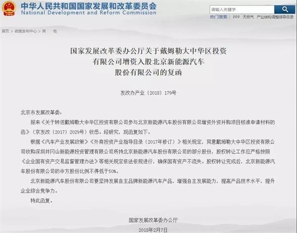 近日,国家发改委发布了《关于戴姆勒大中华区投资有限公司增资入股北京新能源汽车股份有限公司的复函》。