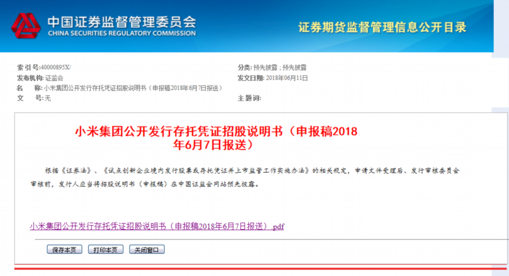 中国证券网讯 6月11日从证监会网站获悉,小米集团在证监会网站披露小米集团公开发行存托凭证招股说明书(申报稿2018年6月7日报送) 。