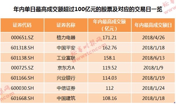 数据显示,年内单日成交金额最高的个股由格力电器“摘得”。今年4月26日,格力电器出现暴跌,盘中一度触及跌停,当日收盘下跌8.97%,全天成交高达171.21亿元。格力电器出现巨量成交并暴跌源于此前一晚披露年报,并自2007年以来首次未分红,引发市场巨大争议,股价由此受到冲击。